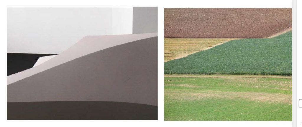 Bene interpreta questi concetti il fotografo Alessandro Balliano che, attraverso punti di vista alternativi, colori vibranti, linee decise e suggestioni poetiche stabilisce un legame forte tra forme geometriche rigorose ed essenziali sapientemente estrapolate, sempre con gusto e misura, da paesaggi urbani, e le forme sinuose e le cromie cangianti che i paesaggi del Monferrato tra i filari delle vigne, i campi arati, i frutteti, sanno offrire.