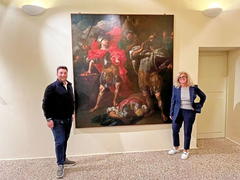 Il notevole dipinto del pittore casalese, vissuto tra il 1698 e il 1757, è un’opera a soggetto mitologico raffigurante una Scena storica, con tecnica ad olio su tela, dal grande formato di 200 centimetri per 220 centimetri.
