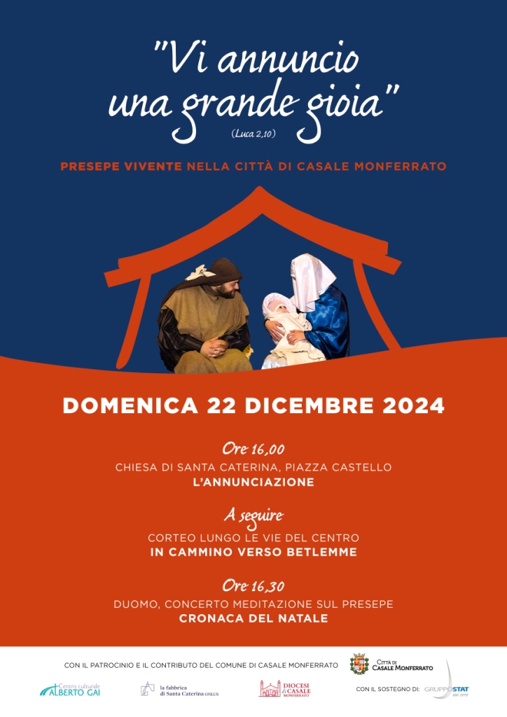 La città sarà ancora una volta lo scenario in cui si svolgerà il presepe vivente organizzato dal Centro culturale Alberto Gai, con il patrocinio della Città di Casale Monferrato e in collaborazione con la Diocesi e La fabbrica di Santa Caterina.