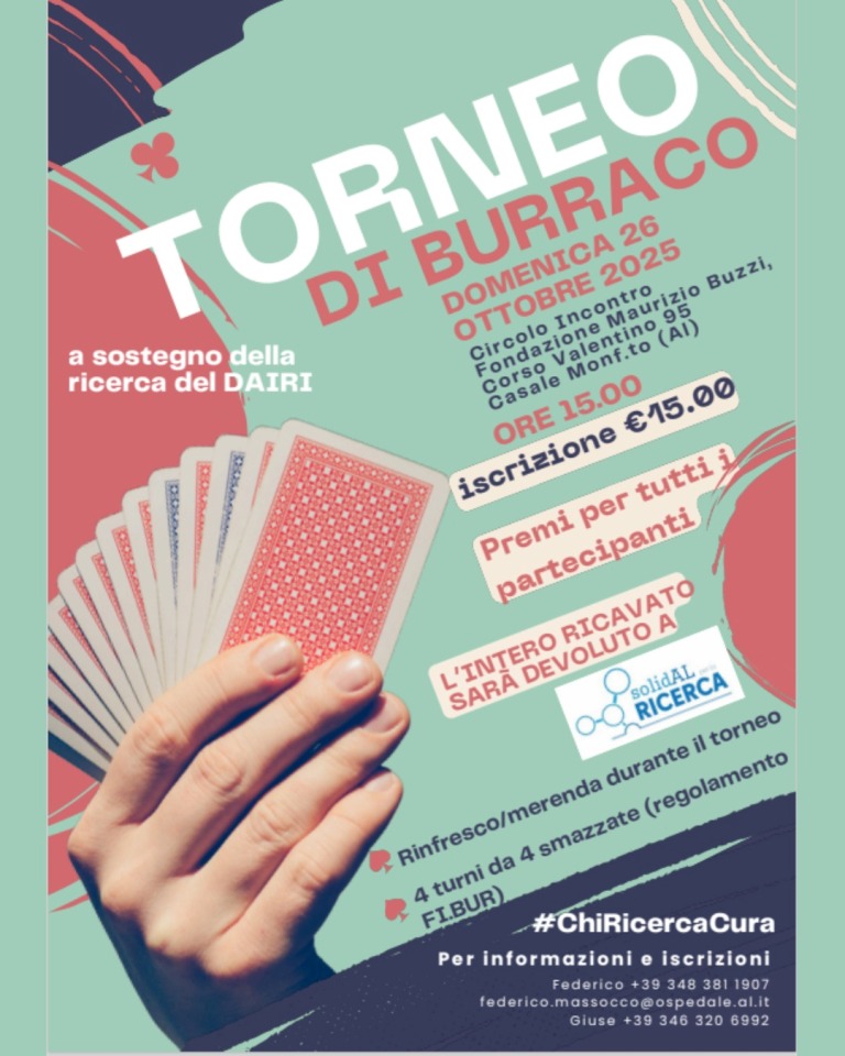 Domenica 26 ottobre alle ore 15 al Circolo Incontro Fondazione Maurizio Buzzi (Corso Valentino 95) andrà infatti in scena il torneo di burraco a sostegno della ricerca.