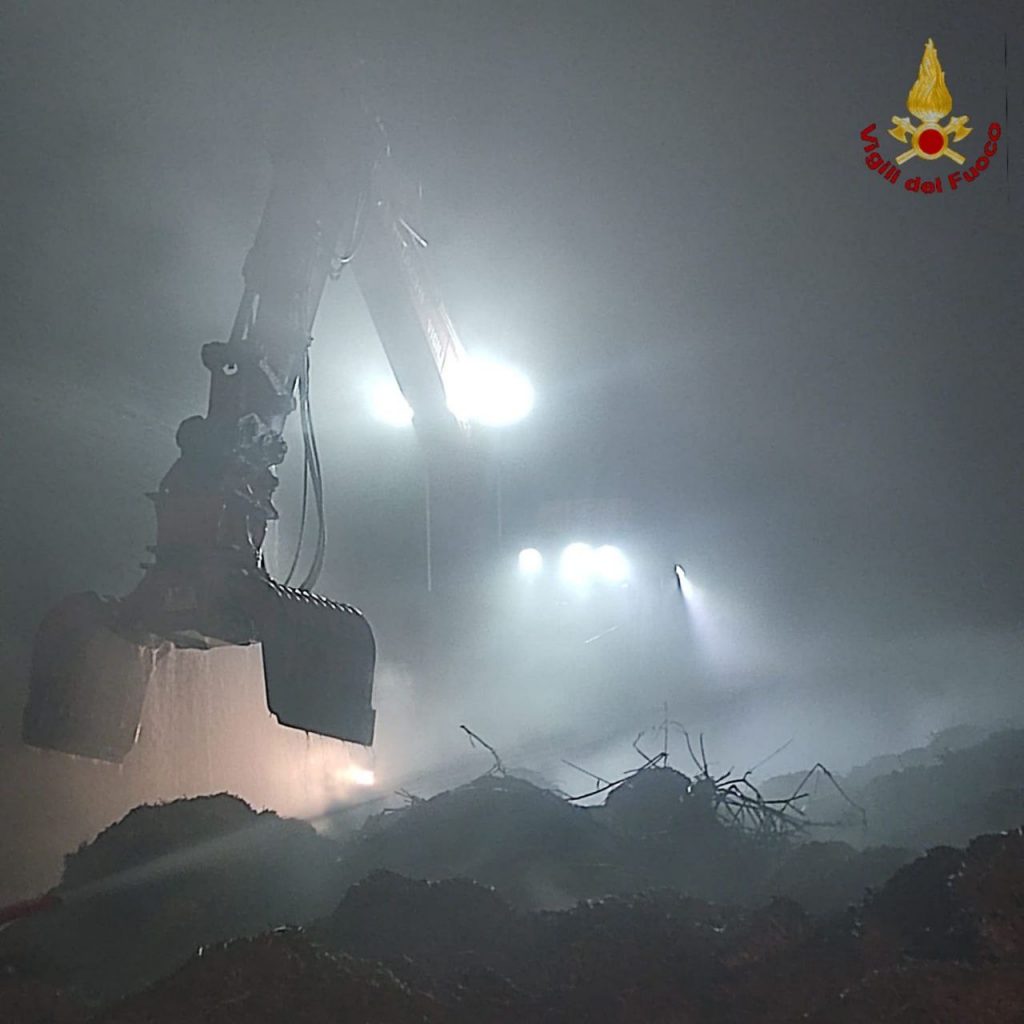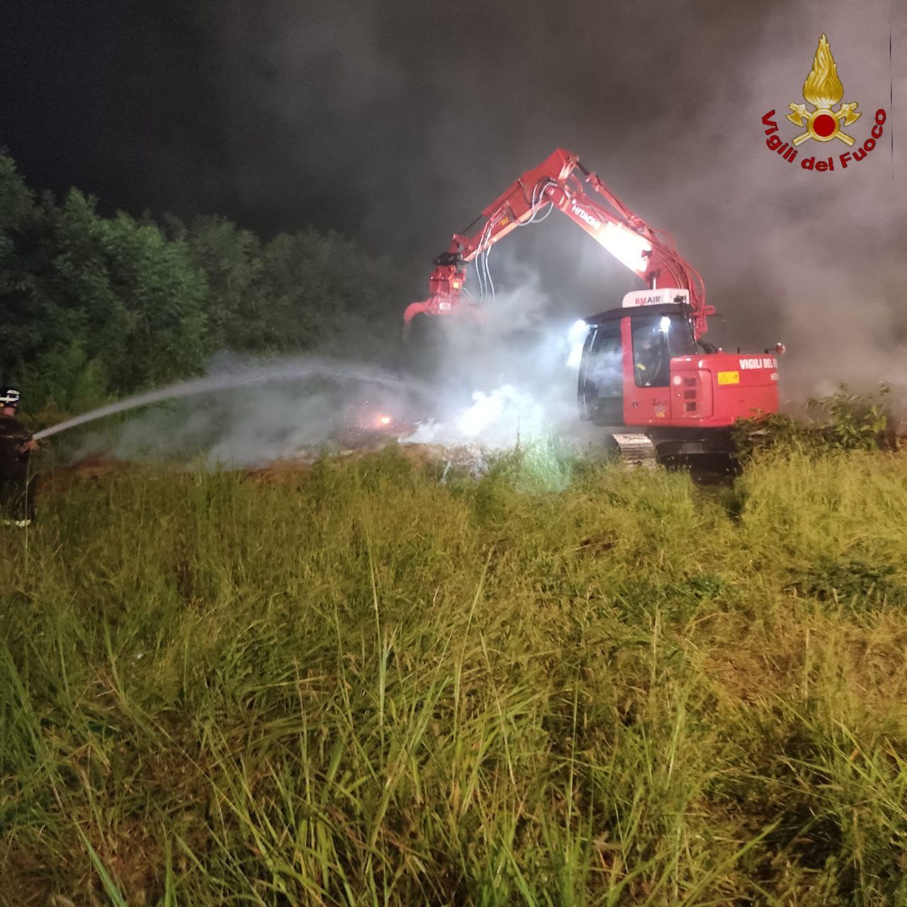 Vista la grande quantità delle rotoballe è intervenuto anche una squadra GOS (Gruppo operativo speciale) con un escavatore, per lo smassamento del materiale bruciato.