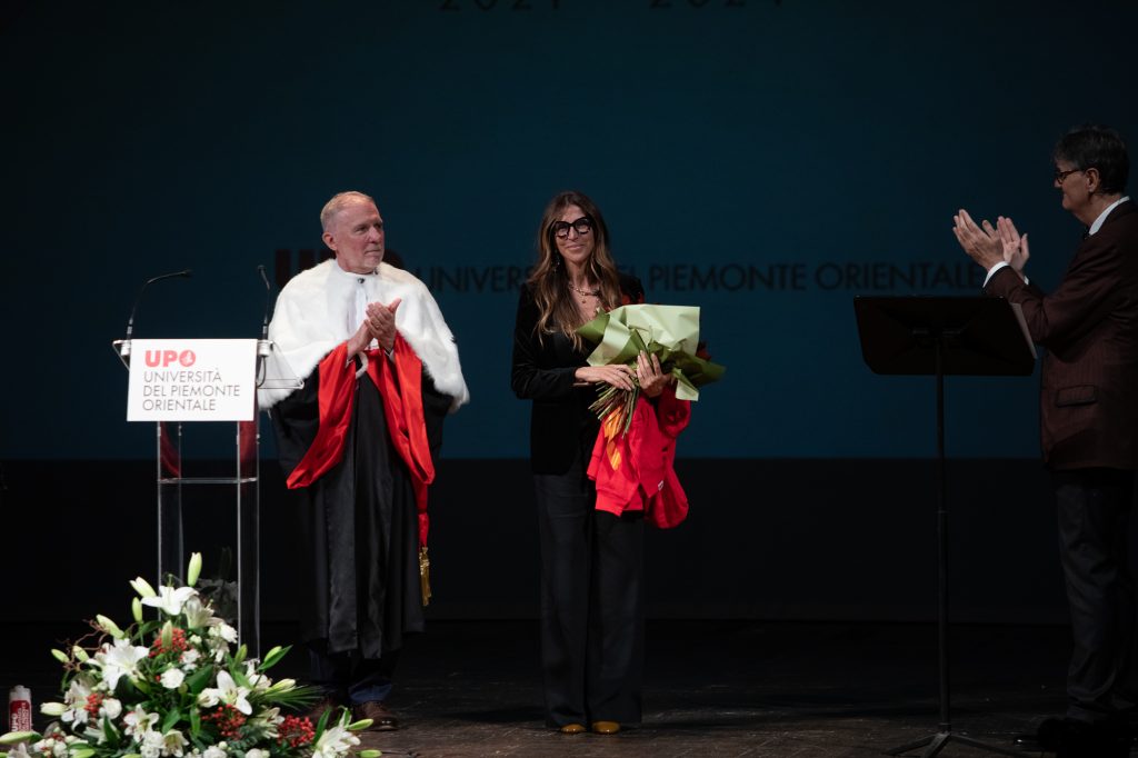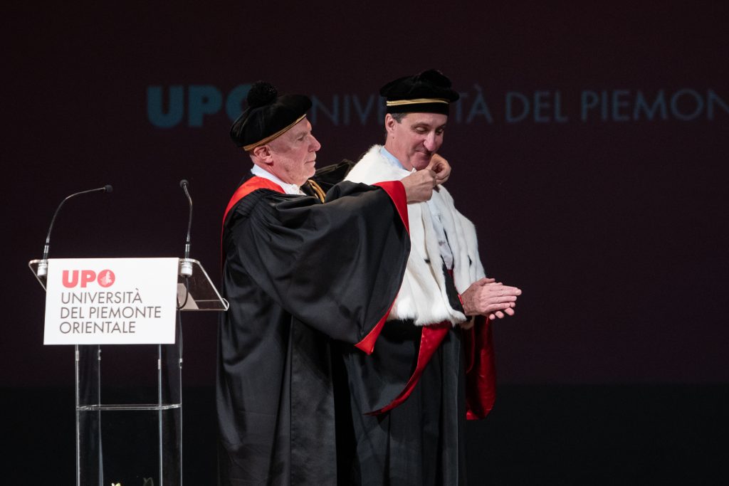 L’evento ha segnato anche il commiato della comunità accademica UPO ai professori prossimi al pensionamento: oltre al rettore uscente Gian Carlo Avanzi, dal 1° novembre saranno collocati a riposo il professor Paolo Garbarino, già rettore dell’UPO dal 2004 al 2012 e professore ordinario di Diritto romano presso il Dipartimento di Studi umanistici, il professor Francesco Della Corte, ordinario di Anestesiologia presso il Dipartimento di Medicina traslazionale, direttore dei centri interdipartimentali Crimedim e Simnova, già consigliere di amministrazione di Ateneo, direttore del Dipartimento di Emergenza e della Struttura Complessa a Direzione Universitaria di Anestesiologia, Rianimazione e Terapia Intensiva dell’AOU “Maggiore della Carità” di Novara e il professor Claudio Rosso, ordinario di Storia moderna presso il DISUM. Non presente per conferenze programmate da tempo, anch’egli a riposo dagli impegni accademici dal 1° novembre, il professor Alessandro Barbero, professore ordinario di Storia medievale presso il DISUM.