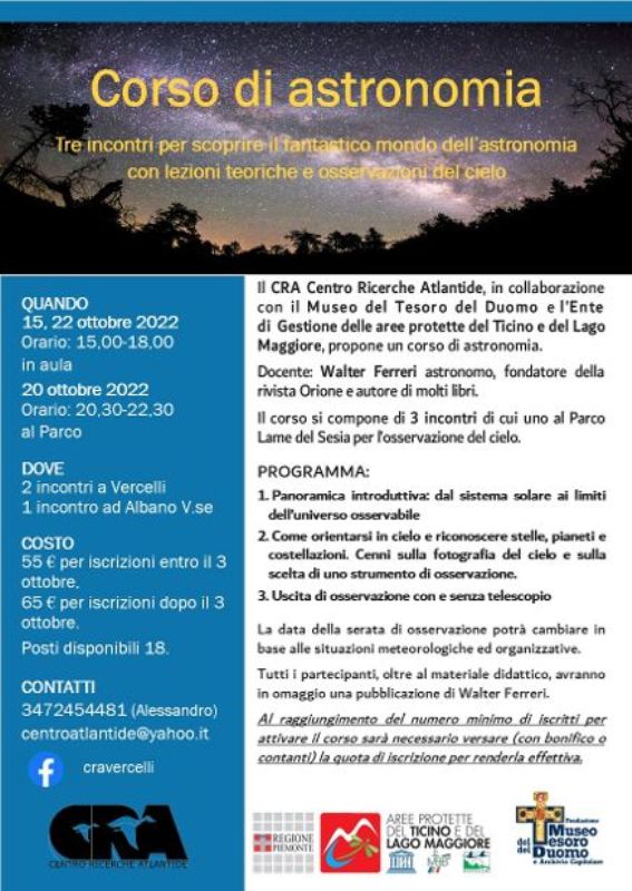 Per soddisfare queste e altre curiosità vi invitiamo al Corso di Astronomia che si terrà a Vercelli a partire dal 15 ottobre 2022, organizzato dal CRA Centro Ricerche Atlantide in collaborazione con il Museo del Tesoro del Duomo e l’Ente di gestione delle Aree Protette del Ticino e del Lago Maggiore.