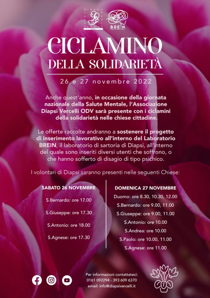 Sabato 26 e domenica 27 davanti ad alcune chiese cittadine Diapsi Vercelli ormai da diversi anni sottolinea la ricorrenza della Giornata Nazionale della Salute Mentale (5 dicembre) offrendo l’occasione ai vercellesi per regalare alle persone amate un vasetto di ciclamini, sempre graditi e anche benefici, in quanto le offerte finanziano l’associazione che si occupa di persone con disagio mentale e delle loro famiglie.