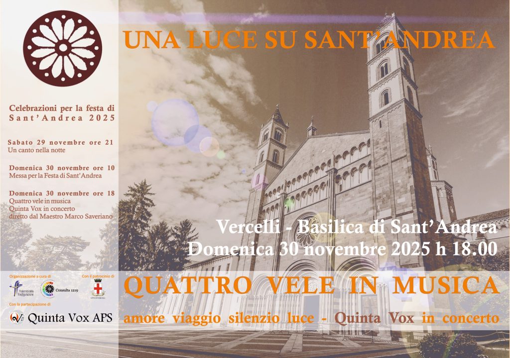il Canto nella notte il sabato sera 29 novembre, la solenne concelebrazione eucaristica presieduta dall’arcivescovo Marco Arnolfo, domenica 30 novembre alle ore 10 e, la stessa domenica alle 18, uno speciale concerto di Quinta Vox, dal titolo Quattro vele in musica.