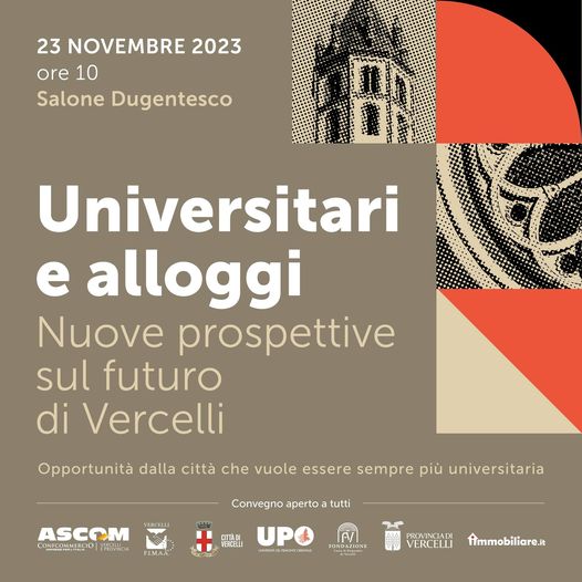 Si terrà giovedì 23 novembre dalle ore 10.00 alle ore 12.30 presso il Salone Dugentesco – Via G. Ferraris, 91- Vercelli – un convegno aperto a tutti sul tema “Universitari e alloggi – Nuove prospettive sul futuro di Vercelli”.