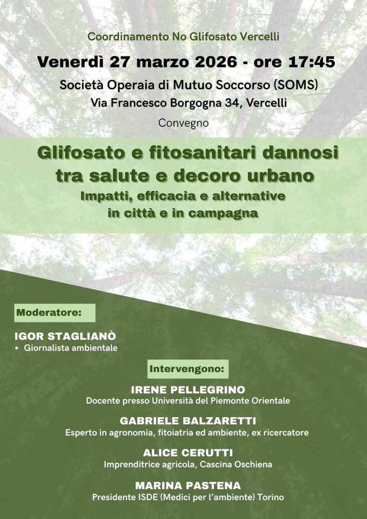 Sarà un’importante occasione di confronto e analisi degli impatti, efficacia e alternative all’utilizzo di prodotti fitosanitari dannosi, a partire dal glifosato. Proprio quelli che l’Amministrazione Comunale di Vercelli ha scelto di reintrodurre in città dopo dieci anni di interruzione. Amministrazione che non ha ancora risposto alla nostra richiesta di gennaio di avere un incontro per avere informazioni sui prossimi passaggi che riguarderanno la cura del verde in città.