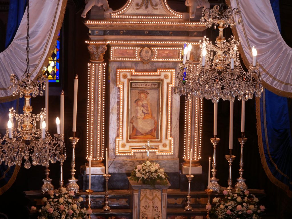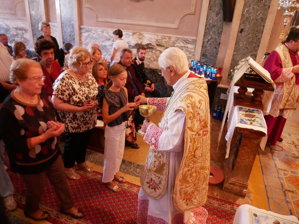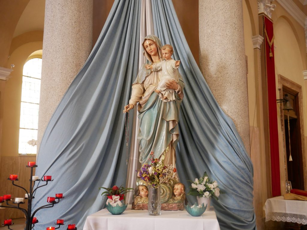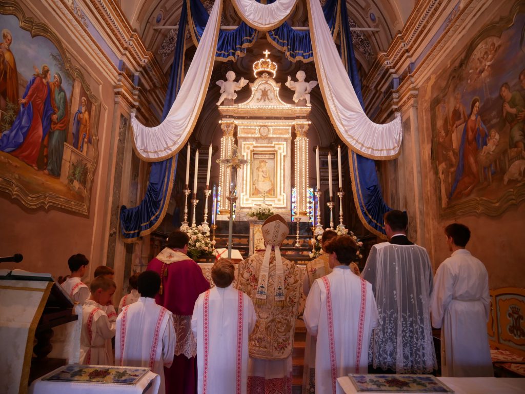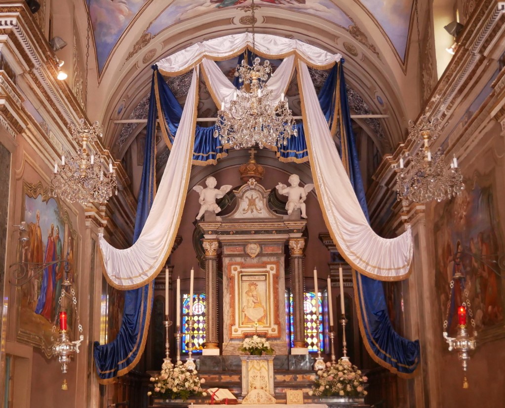 Il paese tirato a lucido, la chiesa parrocchiale splendente, ma veramente straordinario l’allestimento del piccolo Santuario, con i festoni di raso bianchi e blu pensati per incorniciare l’altare, richiamando, nella loro disposizione, l’iniziale del nome di Maria: dalla volta fino al tabernacolo, una grande ‘M’ simbolicamente capace di evocare come ‘per’, tramite Maria, si vada al suo così unico Figlio.