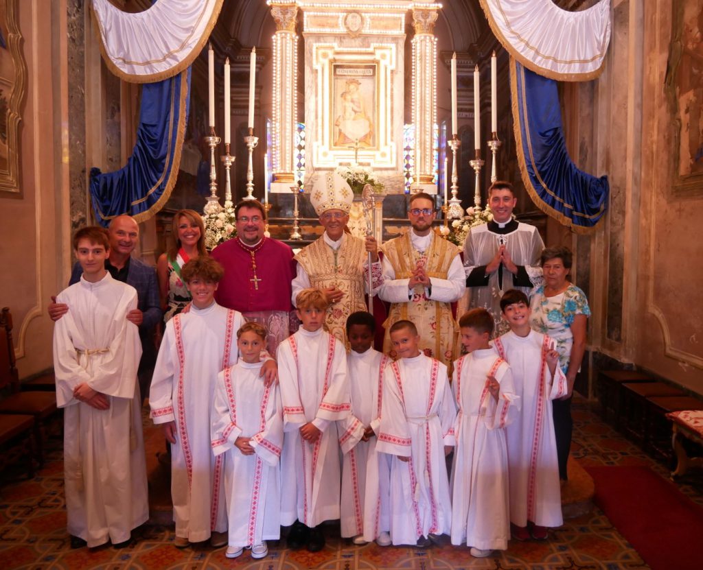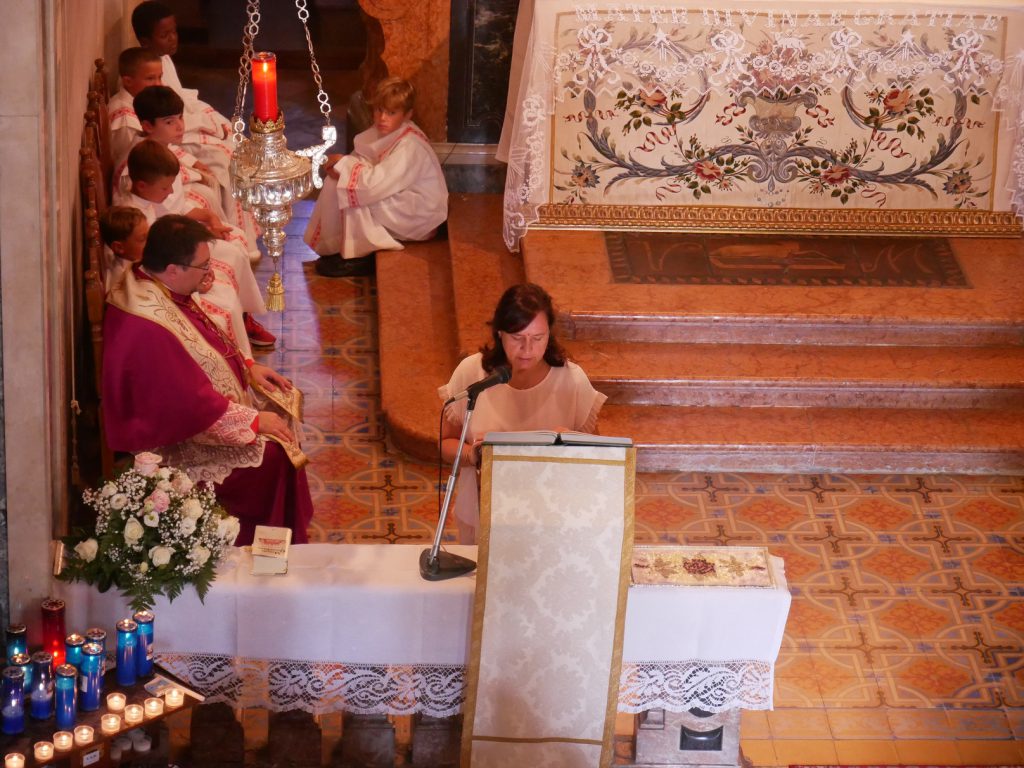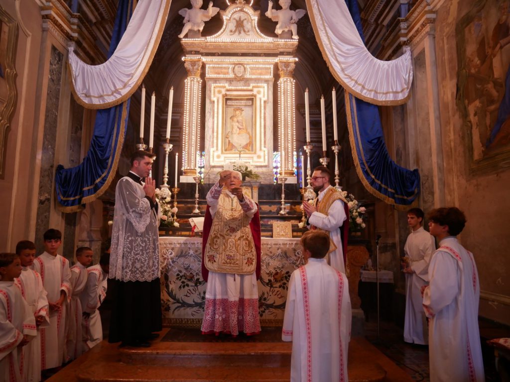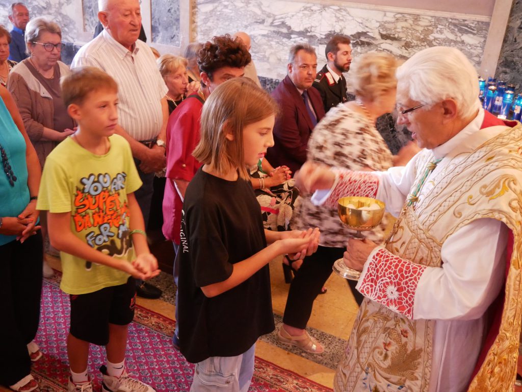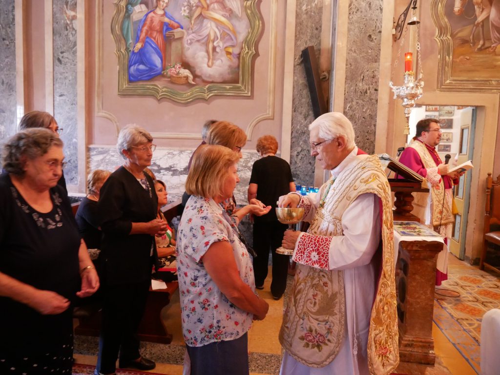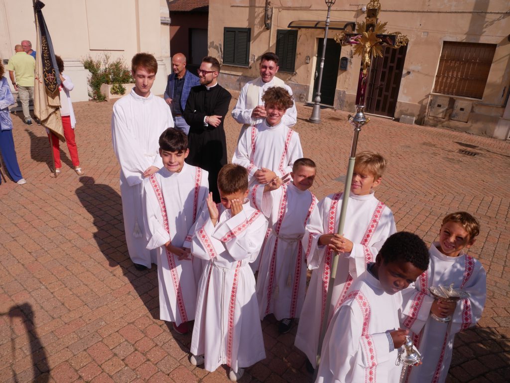 Il paese tirato a lucido, la chiesa parrocchiale splendente, ma veramente straordinario l’allestimento del piccolo Santuario, con i festoni di raso bianchi e blu pensati per incorniciare l’altare, richiamando, nella loro disposizione, l’iniziale del nome di Maria: dalla volta fino al tabernacolo, una grande ‘M’ simbolicamente capace di evocare come ‘per’, tramite Maria, si vada al suo così unico Figlio.
