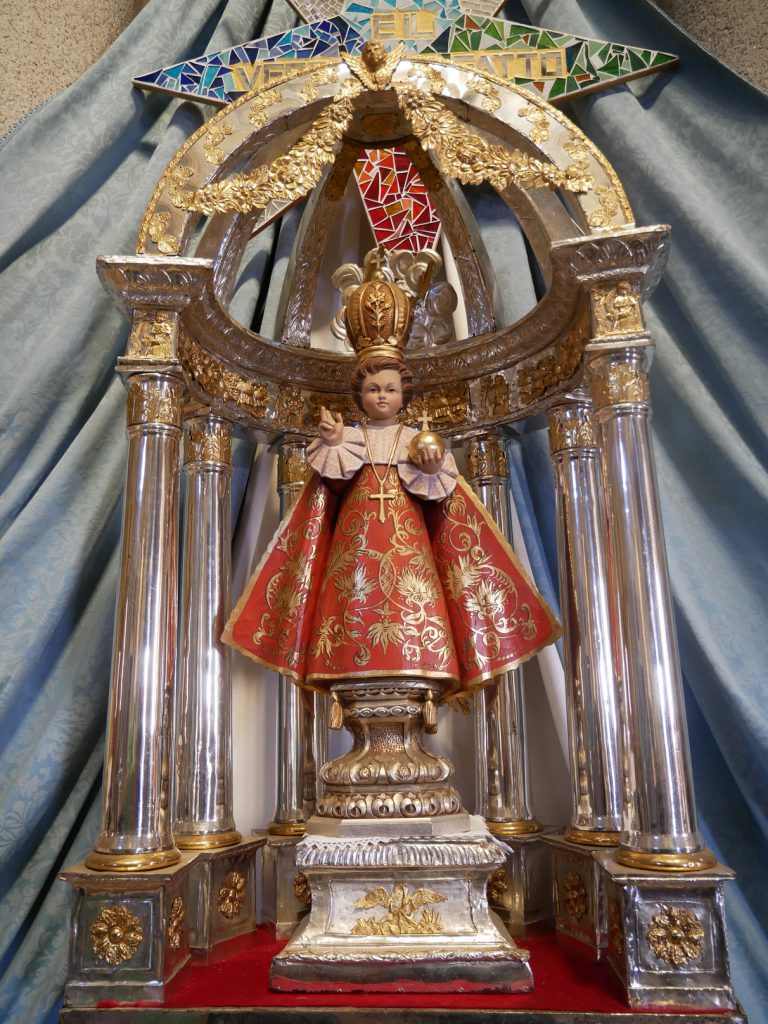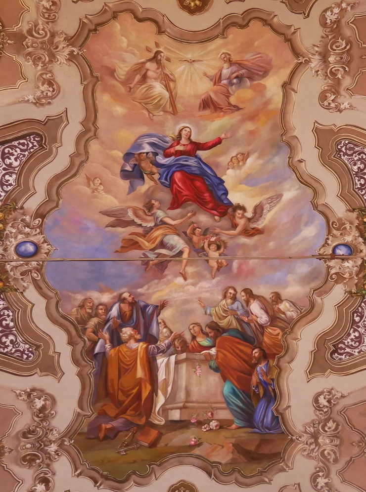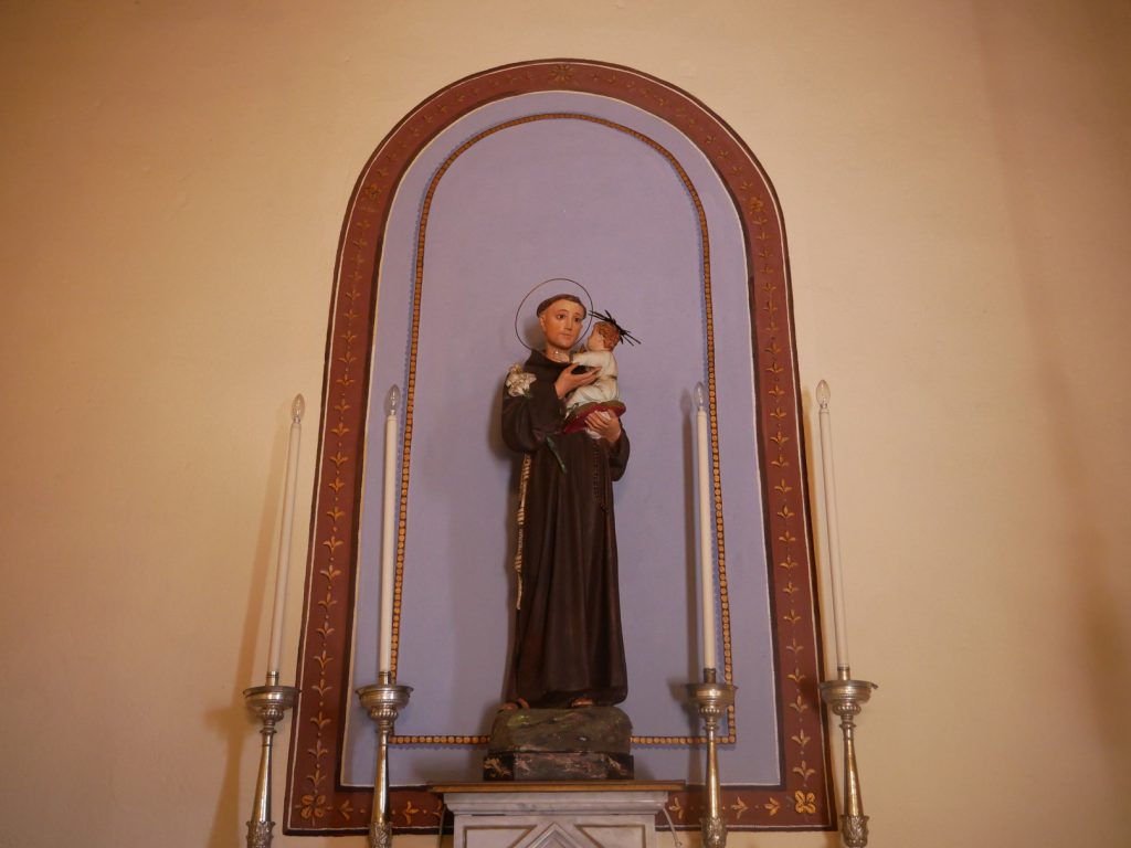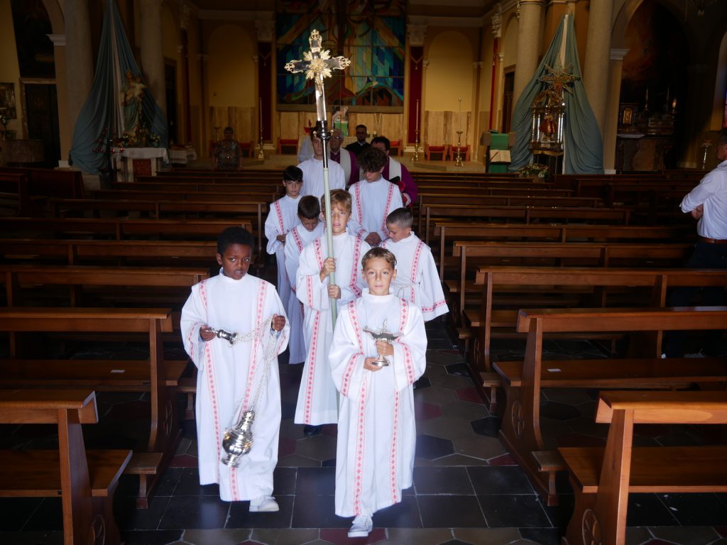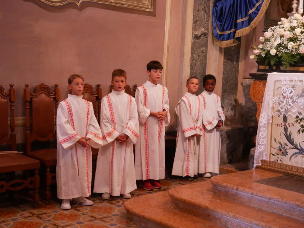 Il paese tirato a lucido, la chiesa parrocchiale splendente, ma veramente straordinario l’allestimento del piccolo Santuario, con i festoni di raso bianchi e blu pensati per incorniciare l’altare, richiamando, nella loro disposizione, l’iniziale del nome di Maria: dalla volta fino al tabernacolo, una grande ‘M’ simbolicamente capace di evocare come ‘per’, tramite Maria, si vada al suo così unico Figlio.