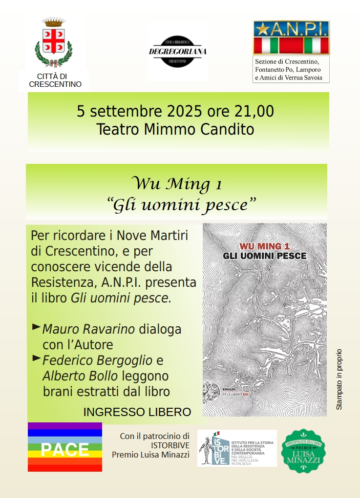 “La sezione Anpi è lieta di ospitare lo scrittore Roberto Bui (Wu Ming 1) – sottolinea la presidente Marilena Vittone – che dialogherà con il giornalista Mauro Ravarino sul testo. Le tematiche sono di attualità: guerra, resistenza, ruolo della cultura, siccità sul Po, cambiamenti di identità. Ringrazio per la collaborazione l’Amministrazione comunale, la Biblioteca Degregoriana, il premio Luisa Minazzi”.
