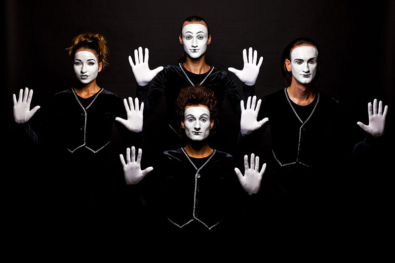Il quartetto Dekru esprime l’archetipo del teatro. Utilizza la potenza iconica della figura del mimo per esaltare le emozioni del pubblico: dall’effetto comico del riconoscere i tic della vita di tutti i giorni (in ufficio, in ascensore, in auto) alle suggestioni suscitate da immagini fantasiose come un giardino incantato e un fondale marino abitato da curiose creature.
