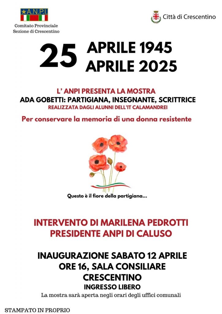 CRESCENTINO – L’ANPI presenta la mostra “Ada Gobetti, partigiana, insegnante, scrittriceL’evento in occasione dell’80esimo anniversario della Liberazione d'Italia dal nazifascismo (1945/2025) Cultura e Spettacolo 07/04/202512/04/2025 Crescentinese