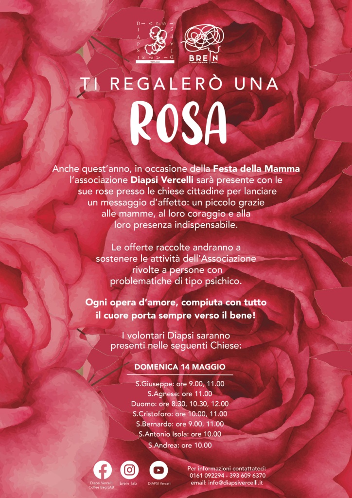 Torna una classica iniziativa benefica di Diapsi Vercelli, che si tiene tutti gli anni in occasione della Festa della Mamma: “Ti regalerò una rosa” per un doppio gesto d’amore, verso le mamme ma anche verso le persone che l’associazione sostiene.