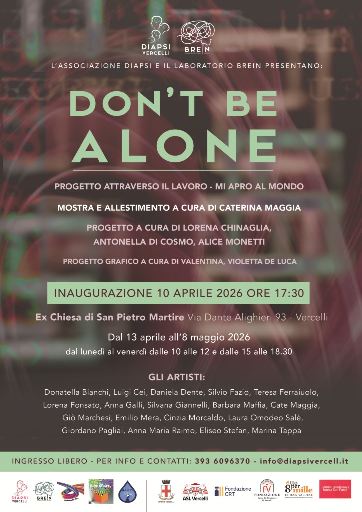 Si tratta della mostra “Don’t Be Alone” che verrà inaugurata In San Pietro Martire, venerdì 10 aprile alle ore 17,30 e resterà allestita, a ingresso libero, fino all’8 maggio, dal lunedì al venerdì dalle 10 alle 12 e dalle 15 alle 18,30.