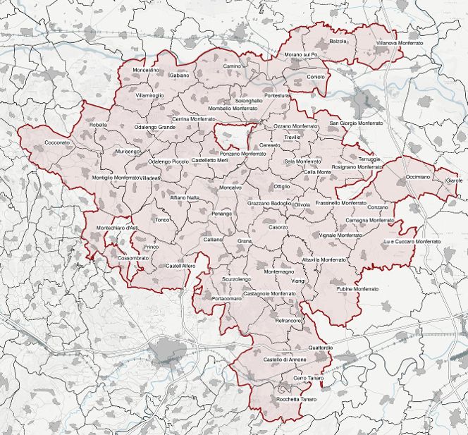 Comuni Aderenti: Alfiano Natta, Altavilla Monferrato, Balzola, Calliano, Camagna Monferrato, Camino, Casorzo, Castagnole Monferrato, Castell’alfero, Castelletto Merli, Castello Di Annone, Cella Monte, Cereseto, Cerrina Monferrato, Cerro Tanaro, Cocconato, Coniolo, Conzano, Cossombrato, Frassinello Monferrato, Frinco, Fubine Monferrato, Gabiano, Giarole, Grana, Grazzano Badoglio, Lu E Cuccaro Monferrato, Mombello Monferrato, Montechiaro D’asti, Montemagno, Montiglio Monferrato, Morano Po, Murisengo, Occimiano, Odalengo Grande, Odalengo Piccolo, Olivola, Ottiglio, Ozzano Monferrato, Penango, Pontestura, Ponzano Monferrato, Portacomaro, Quattordio, Refrancore, Robella, Rocchetta Tanaro, Rosignano Monferrato, Sala Monferrato, San Giorgio Monferrato, Scurzolengo, Solonghello, Terruggia, Tonco, Treville, Viarigi, Vignale Monferrato, Villadeati, Villamiroglio, Villanova Monferrato