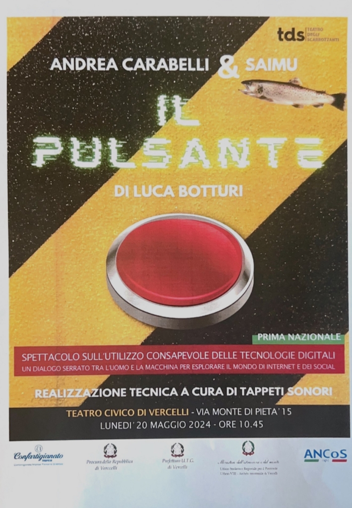 Andrà in scena il prossimo 20 maggio alle ore 11.00, in prima nazionale, presso il Teatro Civico di Vercelli, lo spettacolo teatrale “Il Pulsante” di Luca Botturi, Professore in “Media” in educazione presso il Dipartimento formazione e apprendimento della Scuola universitaria professionale della Svizzera italiana a Locarno, realizzato dall’attore Andrea Carabelli con la compagnia “Teatro degli Scarrozzanti”.