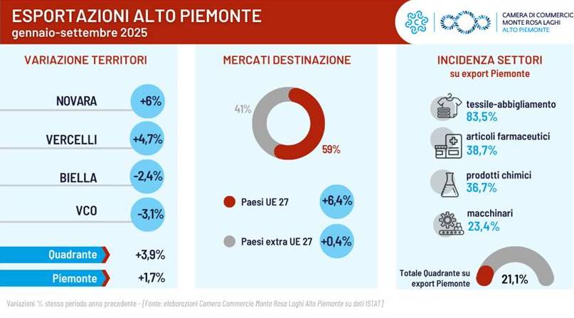 Nei primi nove mesi del 2025 il valore delle esportazioni dell’Alto Piemonte, l’area che comprende le province di Biella, Novara, Vercelli e del Verbano Cusio Ossola, ha raggiunto i 9,7 miliardi di euro, registrando una crescita del +3,9% rispetto allo stesso periodo del 2024.