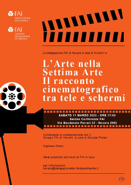 Per conoscere e comprendere gli innumerevoli e svariati aspetti di quest’espressione artistica il gruppo FAI Giovani Vercelli e la Delegazione FAI di Novara invitano a partecipare sabato 11 marzo alle ore 17 alla conferenza L’Arte nella Settima Arte. Il racconto cinematografico tra tele e schermi, a cura di Giorgia Pistan, Dottoressa in Storia dell’Arte e delegata FAI Vercelli.