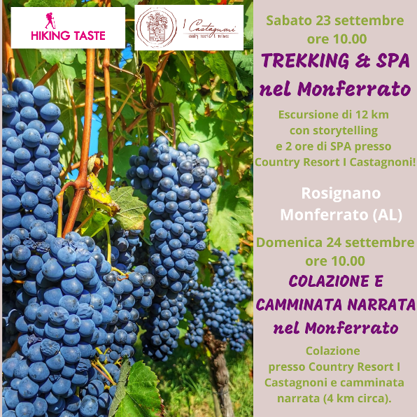 Sabato 23 settembre (con partenza alle ore 10 in località Castagnoni 67) si svolgerà “Trekking & Spa nel Monferrato” ossia un mix di sana camminata sui pendii che da li a poco si vestiranno di foliage autunnale (itinerario di 12 km, con storytelling a cura di Hiking Taste, per meglio conoscere il territorio) e attimi di puro relax pomeridiano (della durata di due ore) nella piccola spa panoramica de “I Castagnoni”, il Country & Wellness Resort vista colline Unesco! Domenica 24 settembre (con ritrovo alle 10 presso “I Castagnoni”, in loc. Castagnoni 67) nuovo appuntamento, firmato ancora una volta da Hiking Taste, questa volta denominato “Colazione e Camminata Narrata nel Monferrato”: si prevede una passeggiata (4 km complessivamente) preceduta dalla Colazione a cura de “I Castagnoni”