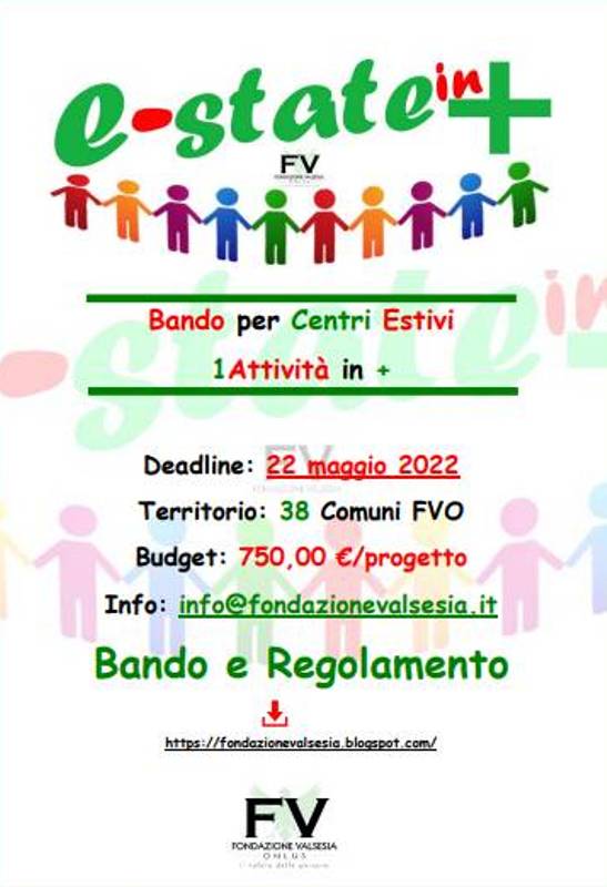 Torna il bando E-State in + edizione 2022 dedicato ai Centri Estivi valsesiani mantenendo inalterata la formula ma potenziando il budget per i singoli progetti presentati: 750,00 € per progetto dedicato ad aggiungere 1 o + attività gratuite al programma ordinario del Centro Estivo, realizzate da professionisti.