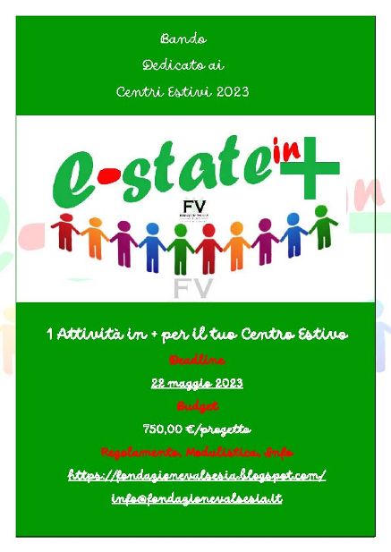 Tante splendide attività sono state realizzate negli anni scorsi ed ora siamo pronti ad accogliere e idee e i progetti per l’estate 2023, invitiamo gli enti organizzatori di centri estivi, grest e camp sportivi a partecipare al bando arricchendo l’estate dei più giovani con tante novità, continuando a creare insieme buone energie che favoriscano la cultura della contaminazione e dell’inclusione.