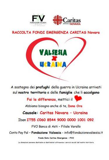 Si può donare sull’Iban di FVO IT55 C060 8544 9000 0000 1001 092, c.c. Banca di Asti – Filiale Varallo, o sul conto Pay Pal – Fondazione Valsesia – info@fondazionevalsesia.it causale Caritas Novara- Ucraina sul Fondo Rete Caritas Emergenze – FVO. Fai la differenza!