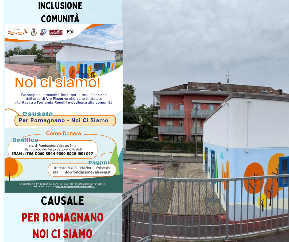 24/10/202425/10/2024 Valsesia e Valsessera FONDAZIONE VALSESIA – Romagnano - Aperta una nuova raccolta fondi per la riqualificazione dell’area sportiva di Via Pizzorno La raccolta fondi è stata aperta dal Comune di Romagnano, in collaborazione con Noi Ci Siamo Odv e la fondazione La Nosta Gent