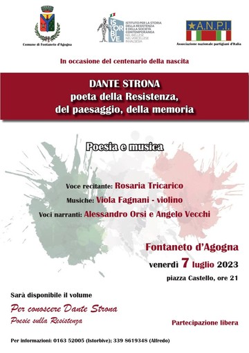 Venerdì 7 luglio 2023, a Fontaneto d’Agogna, in piazza Castello, alle ore 21, si terrà la serata di poesia e musica Dante Strona poeta della Resistenza, del paesaggio, della memoria, iniziativa organizzata, nell’occasione del centenario della nascita di Dante Strona, dal Comune di Fontaneto d’Agogna, dall’Istituto per la storia della Resistenza e della società contemporanea nel Biellese, nel Vercellese e in Valsesia (Istorbive) e dall’Anpi.