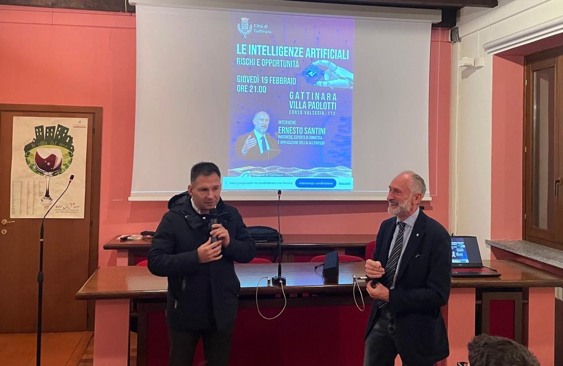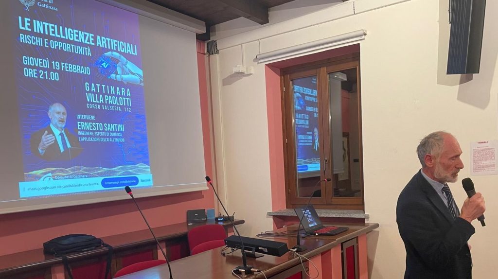 Il Vice Sindaco Daniele Baglione, ha brevemente introdotto il relatore Ernesto Santini, (laureato in ingegneria elettronica nel 1980 presso il Politecnico di Milano, con una tesi volta a riconoscere la scrittura manuale corsiva con le telecamere utilizzando algoritmi bayesiani (un insieme di metodi statistici e di machine learning basati sul Teorema di Bayes, utilizzati per modellare l’incertezza, effettuare inferenze e prendere decisioni basate su dati osservati), che ha lavorato per Honeywell Information Systems a Pregnana Milanese e, dal 1990, per Bticino.