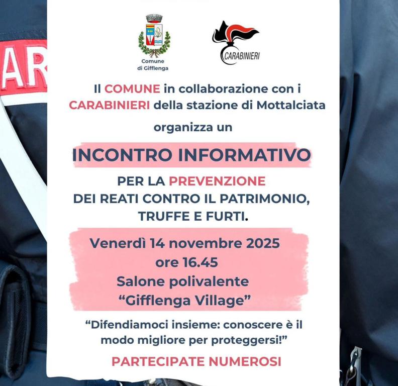 Il Comune di Gifflenga, in stretta collaborazione con i Carabinieri della Stazione di Mottalciata, è lieto di annunciare l’organizzazione di un incontro formativo e informativo dedicato alla prevenzione dei reati contro il patrimonio, con particolare attenzione a truffe e furti.
