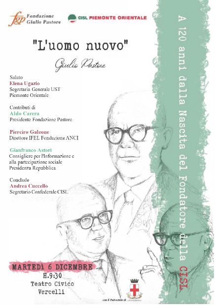 “L’uomo nuovo”: è questo il titolo del convegno organizzato dalla Cisl Piemonte Orientale e dalla Fondazione Giulio Pastore, al teatro Civico di Vercelli, in via Monte di Pietà 15, martedì 6 dicembre, dalle ore 9.30 alle 13, in occasione del 120° anniversario della nascita del fondatore del sindacato di via Po.