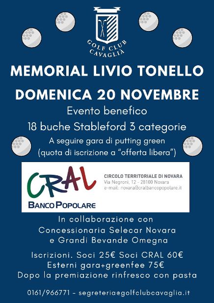 Domenica 20 novembre al Gc Cavaglià si svolgerà la prima edizione del Memorial Livio Tonello (18 buche, Stableford, 3 categorie – Iscrizioni: soci 25€, esterni 75€, soci Cral 60€), evento benefico organizzato dal Cral.