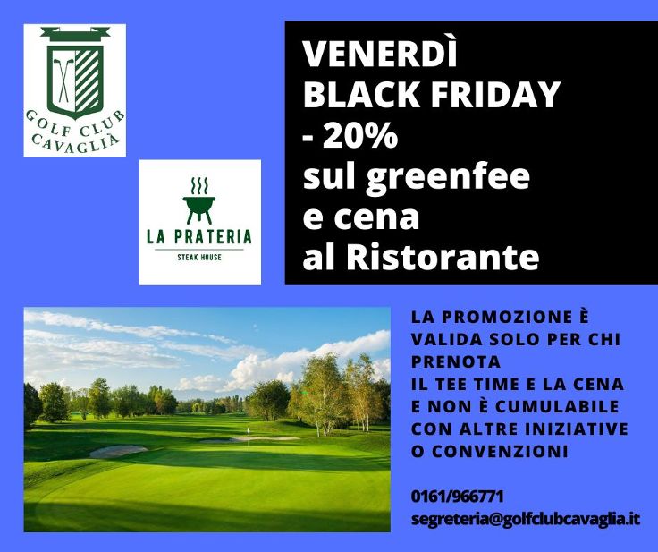 Nell’ultimo weekend di novembre al Gc Cavaglià si disputerà la Ferro 9 Cup, louisiana a coppie sulla distanza di 18 buche punteggio Stableford (iscrizione gara soci 20€, esterni gara + green fee 70€). Dopo la premiazione a seguire buffet. Venerdì sarà invece giornata di Black Friday, con sconto (non cumulabile con altre iniziative) del 20% su green fee e cena al Ristorante.