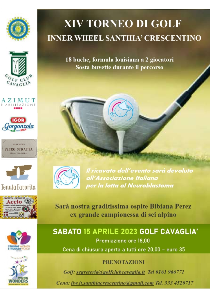 Sabato 15 aprile torna il Torneo Inner Wheel Santhià e Crescentino (Louisiana a coppie, 18 buche Stableford – iscrizione soci 25€, esterni gara+greenfee 75€), evento benefico giunto alla 14esima edizione.