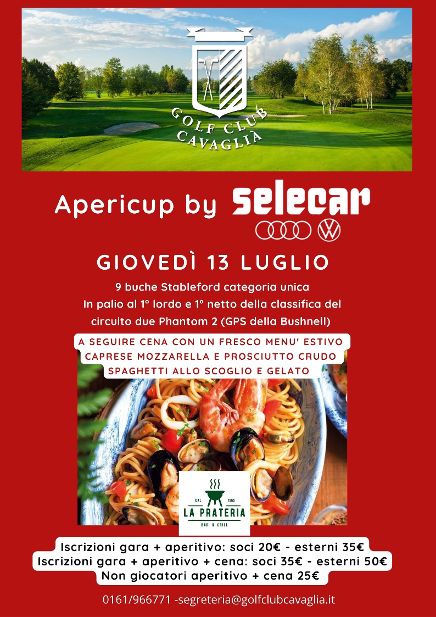 Giovedì 13 luglio prosegue l’Apericup by Selecar il circuito estivo pomeridiano/serale su 9 buche, con cena a seguire che per la terza tappa vedrà protagonista un fresco menù mediterraneo a base di caprese mozzarella e prosciutto crudo, spaghetto allo scoglio e gelato.