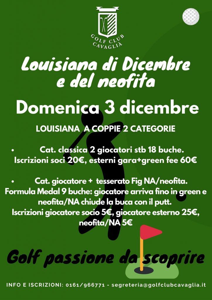 Louisiana classica 18 buche Stableford (iscrizione: soci 20€ – esterni gara + gren fee 60€) e categoria giocatore + tesserato Fig NA/neofita 9 buche (soci e neofiti 5€, giocatore esterno 25€) con formula Medal 9 buche (giocatore arriva fino in green e neofita/NA chiude la buca con il putter).