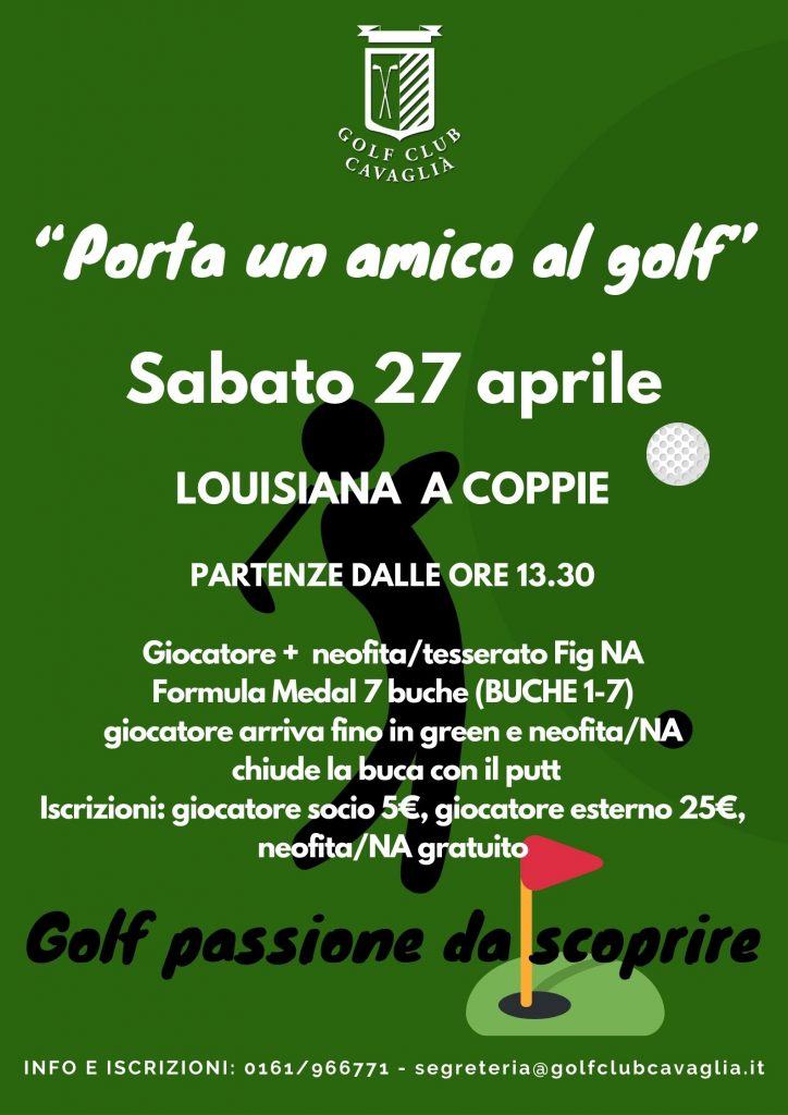 Sempre sabato (partenze dopo le 13,30) si giocherà la gara promozionale su 7 buche “Porta un amico al golf” (Louisiana giocatore + neofita/tesserato NA).
