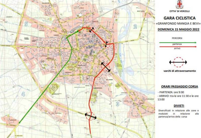 - domenica 15 maggio 2022 dalle ore 8:45 sino al passaggio dell’autovettura di “FINE CORSA” è temporaneamente vietata circolazione di tutti i veicoli lungo le strade e/o piazze costituenti l’itinerario di andata della gara ciclistica, ricadenti all’interno del territorio comunale, segnatamente: corso Gastaldi, corso Fiume, piazza Mazzucchelli, via Paggi, via Trino;