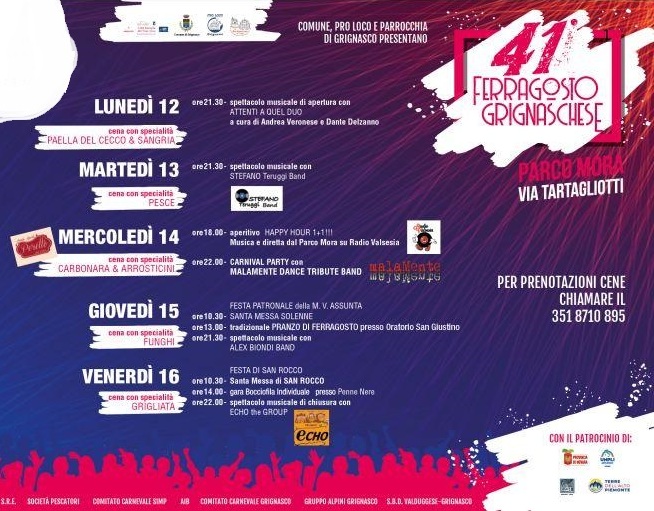I festeggiamenti del tradizionale Ferragosto Grignaschese, giunto alla 41esima edizione, saranno dal 12 al 16 agosto al Parco Mora durante il quale sarà possibile ogni sera degustare cene con specialità; anche quest’anno altre associazioni di Grignasco oltre al Comune e alla Pro-loco collaboreranno per la buona riuscita dell’evento e precisamente: Società Pescatori, S.R.E., Comitato Carnevale Simp, Comitato Carnevale Grignasco, Gruppo Alpini Grignasco e SBD Valduggese-Grignasco.