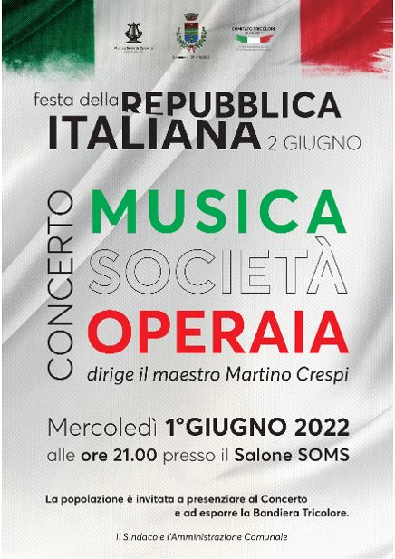 L’Amministrazione Comunale, in collaborazione con la Musica Società Operaia e con il Comitato Tricolore Grignasco (Comitato d’Intesa tra le Associazioni Combattentistiche e d’Arma), celebrerà mercoledì 1° giugno la Festa della Repubblica Italiana (simbolo patrio italiano e giornata celebrativa nazionale istituita per ricordarne la nascita a seguito di referendum nel 1946).