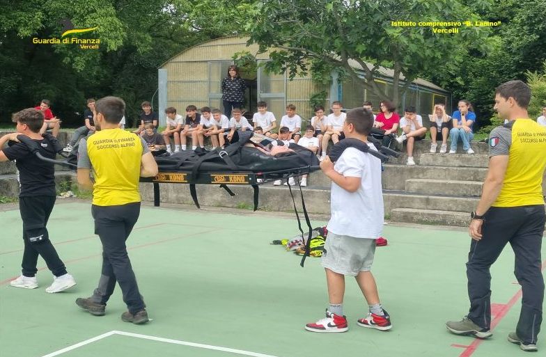 Per rendere accattivante l’incontro con gli alunni più giovani della scuola Lanino, i militari specializzati della Stazione di Soccorso Alpino della Guardia di Finanza di Alagna Valsesia (VC) hanno simulato la ricerca e il soccorso di una persona ferita in montagna e illustrato le regole di sicurezza da tenere a mente per le escursioni nelle aree impervie. Poi è stata data una dimostrazione “dal vivo” di come la Guardia di Finanza sia vicino a chi si trova in pericolo di vita, mostrando le abilità di “Jerard”, il cane anti-valanga “in servizio” nel reparto di Alagna Valsesia.