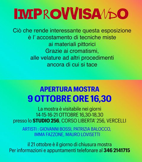 La mostra collettiva “Improvvisando” ordinata presso lo studio d’Arte 256 di c.so Libertà 256 a Vercelli sarà aperta nei giorni 14, 15, 16 e 21 ottobre con orario 16,30 -18,30 con ingresso libero nel rispetto dei protocolli anticovid vigenti.