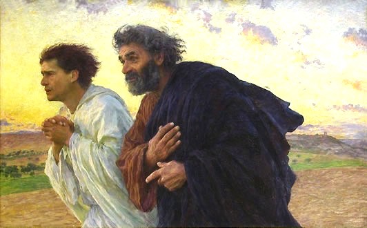 Pietro allora uscì insieme all’altro discepolo e si recarono al sepolcro. Correvano insieme tutti e due, ma l’altro discepolo corse più veloce di Pietro e giunse per primo al sepolcro. Si chinò, vide i teli posati là, ma non entrò.