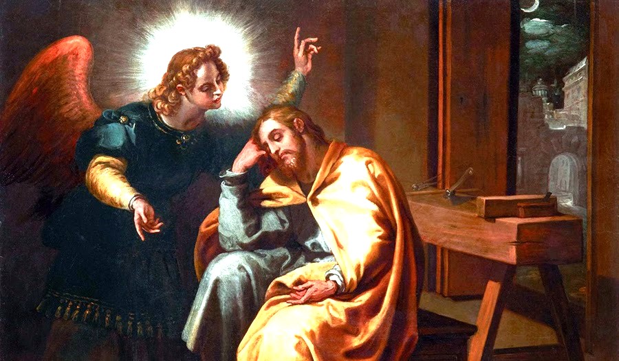 Però, mentre stava considerando queste cose, ecco, gli apparve in sogno un angelo del Signore e gli disse: «Giuseppe, figlio di Davide, non temere di prendere con te Maria, tua sposa. Infatti il bambino che è generato in lei viene dallo Spirito Santo; ella darà alla luce un figlio e tu lo chiamerai Gesù: egli infatti salverà il suo popolo dai suoi peccati».