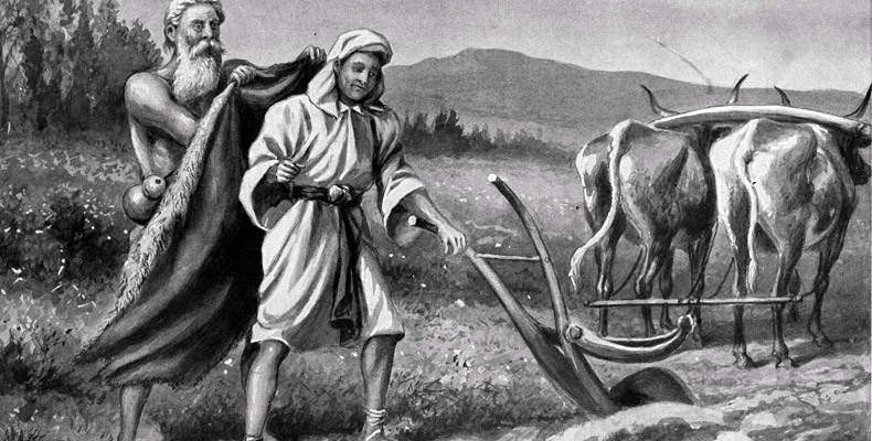 Partito di lì, Elìa trovò Eliseo, figlio di Safat. Costui arava con dodici paia di buoi davanti a sé, mentre egli stesso guidava il dodicesimo. Elìa, passandogli vicino, gli gettò addosso il suo mantello.