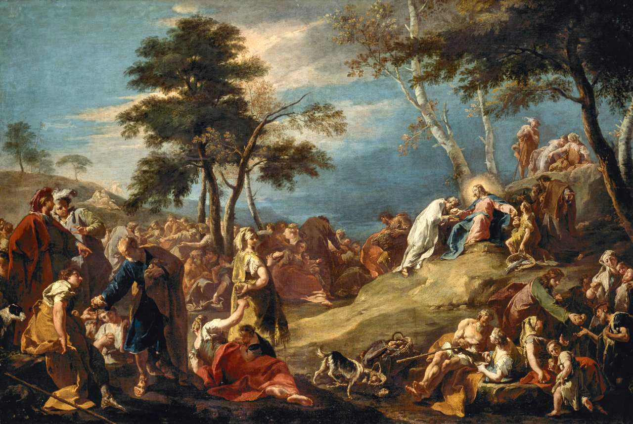 Egli prese i cinque pani e i due pesci, alzò gli occhi al cielo, recitò su di essi la benedizione, li spezzò e li dava ai discepoli perché li distribuissero alla folla.