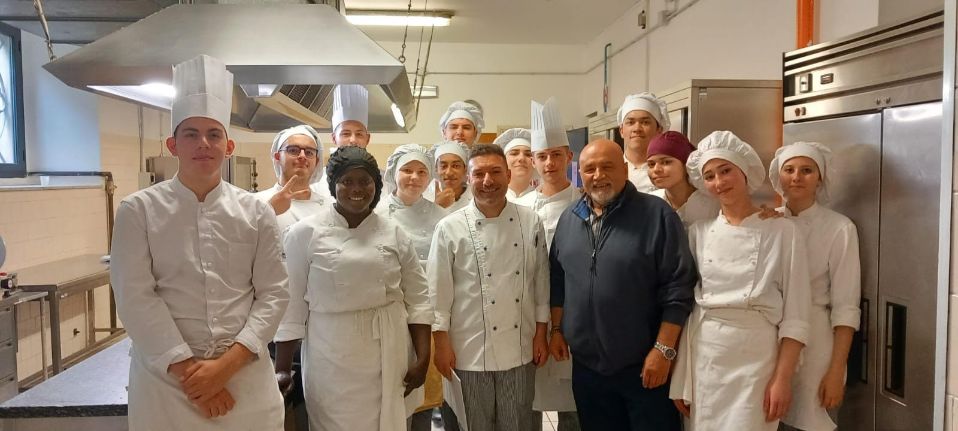 (Nota: in foto alcuni allievi di cucina con il docente prof. Romeo e il signor Piero Fornara (ex allievo dell’ Istituto, diplomato nell’a.s. 1974/ 1975) in rappresentanza del mondo del lavoro)