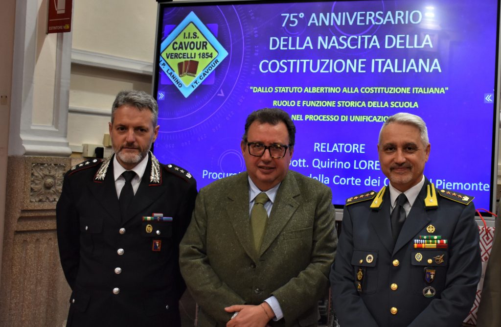 Il Dirigente scolastico prof. Paolo Massara ha ringraziato i partecipanti per aver accolto l’invito: “Saluto le autorità civili, militari e religiose che sono presenti. Sono con noi la Dott.ssa Cristina Lanini vicario del Prefetto di Vercelli, l’assessore Patrizia Evangelisti del Comune di Vercelli, il Presidente della Provincia Davide Gilardino, il Ten. Col. Ciro Natale Comandante provinciale della Guardia di Finanza, il Col. Walter Cappelli della Compagnia dei Carabinieri di Vercelli, il Maggiore Giuseppe De Pitto della Caserma Aldo Maria Scalise, Lella Bassignana presidente Confagricoltura del Piemonte, Anna Palmisano in rappresentanza della Questura di Vercelli, la Dott.ssa Maria Stabile dell’U.S.T, Mons. Giuseppe Cavallone in rappresentanza dell’arcivescovo di Vercelli, e il presidente del nostro Consiglio di Istituto, l’avv. Sandra Lodigiani. Solo due parole, che spero siano concrete: l’educazione civica è trasversale in tutte le classi della scuola e nel nostro Istituto l’insegnamento del diritto è presente in tutti i nostri corsi. I nostri allievi conoscono sicuramente la Costituzione, però il rischio grande è che si consideri la Carta Costituzionale non come un organismo vivo, ma semplicemente come un documento. Conosciamo le sue parti, i suoi principi, magari ci ricordiamo che l’anno scorso i principi fondamentali sono stati integrati con la tutela dell’ambiente, ma poi ci dimentichiamo di quelli che sono i valori che stanno alla base della Costituzione. Iniziative come queste vogliono dare importanza alla conoscenza dei valori di base: i diritti inviolabili dell’uomo. Occasioni come queste vogliono portare i ragazzi a conoscere meglio e a vivere i valori presenti nella nostra Costituzione”.