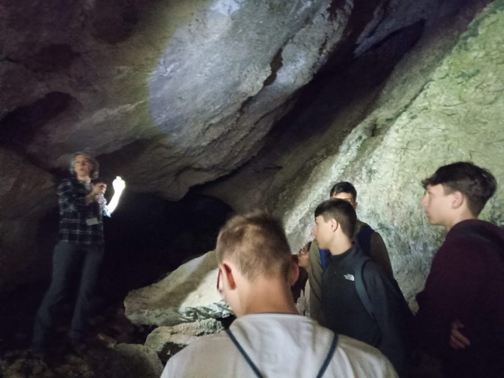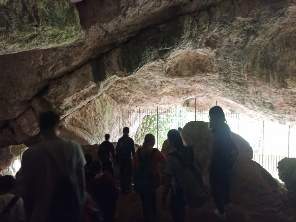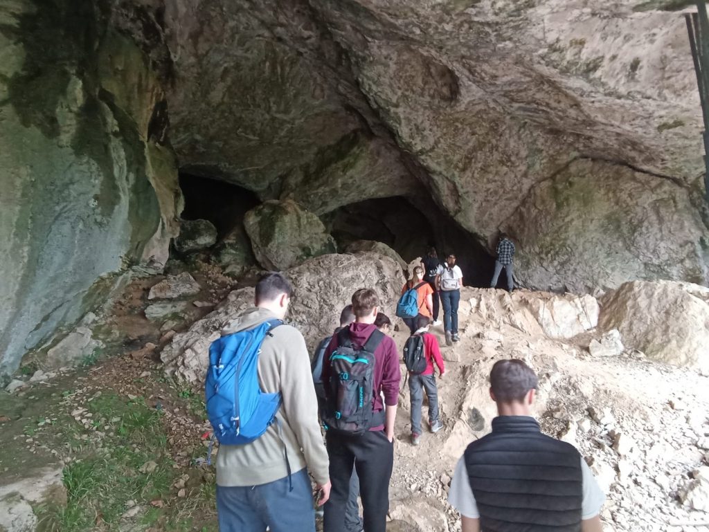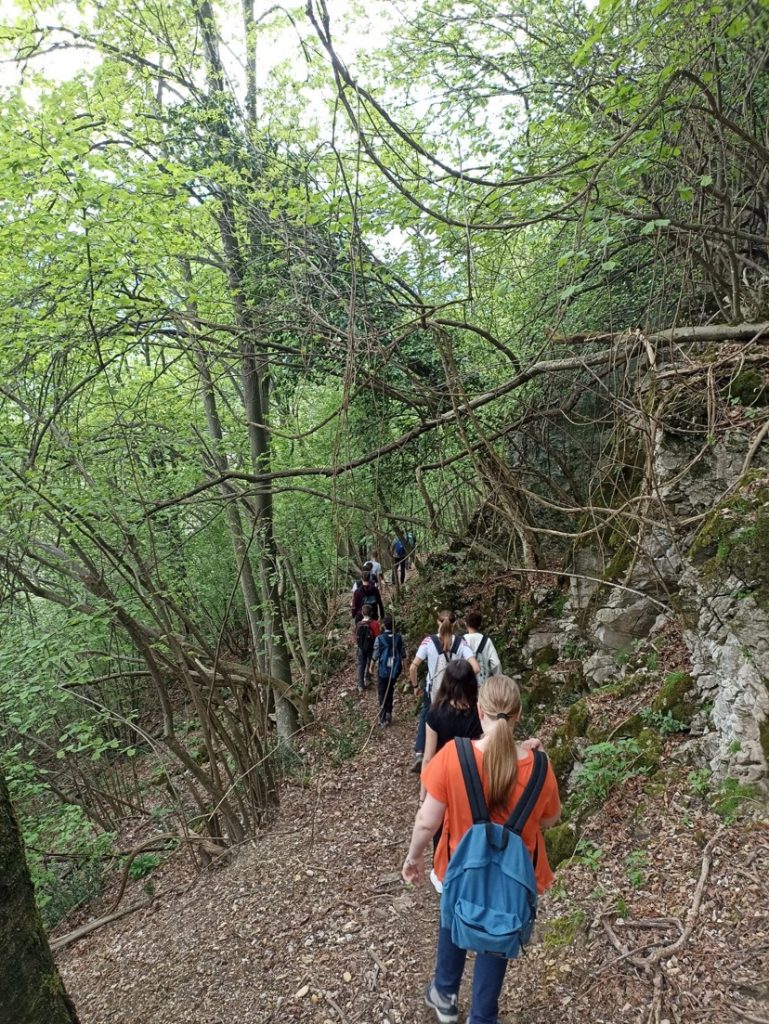 Dopo una salita a piedi di circa un’ora, partendo dal piazzale di fronte alla ditta Franchi, allievi e studenti hanno raggiunto le grotte in due piccoli gruppi, che si sono alternati nelle grotte passando dal Belvedere.